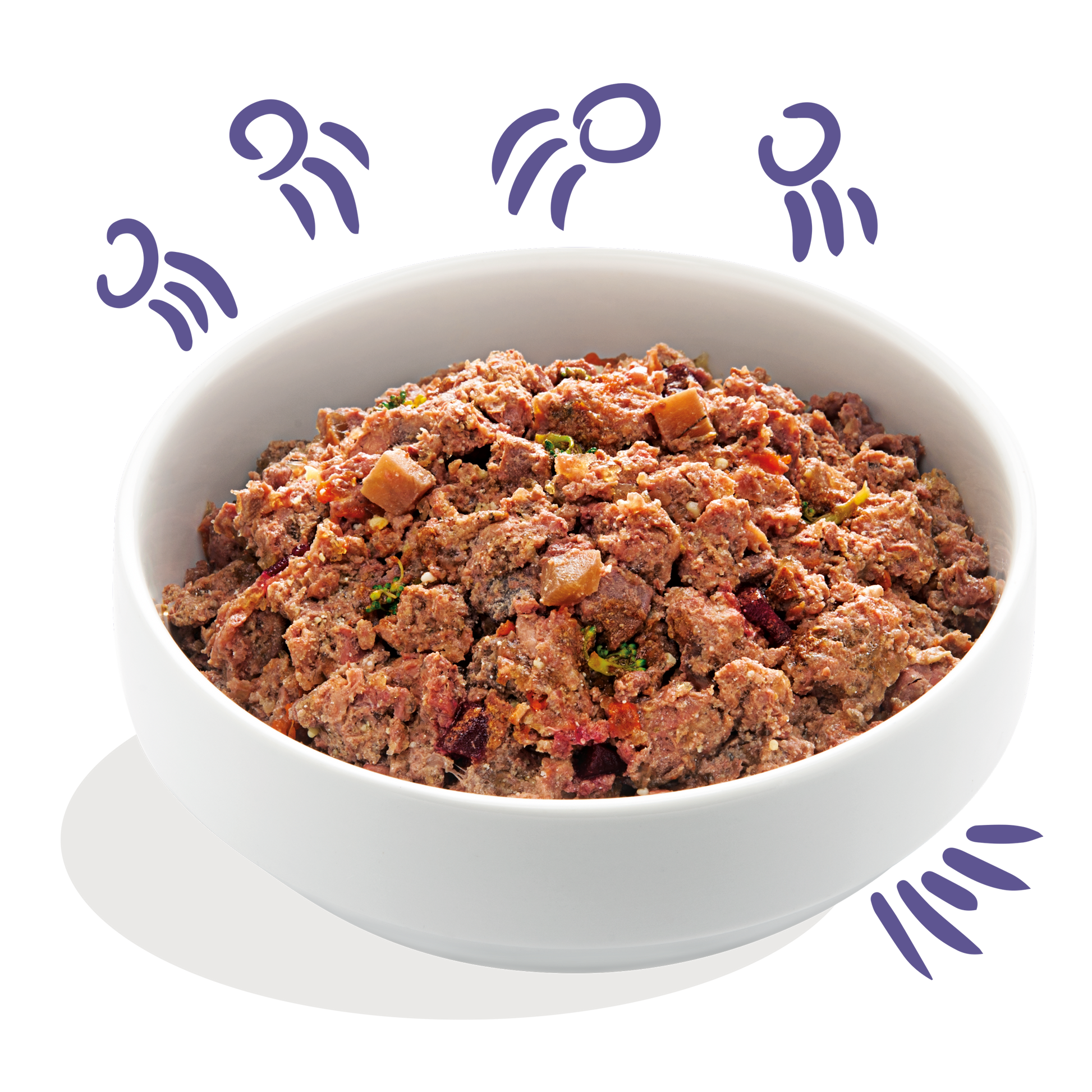 Dit graanvrije recept bevat véél rund met makkelijk verteerbare hoogwaardige eiwitten. We doen er prebiotica bij voor een gezonde darmflora. En als bonus boosten we de voedingswaarde met extra voedzame orgaanvlees (zoals hart en lever). Al onze recepten bevatten een supergezonde mix van fruit en groenten. Met lekkere kruiden en botanicals als surplus. Die fantastische blend garen we zachtjes: zo blijven de smaak en alle goodies perfect bewaard.
